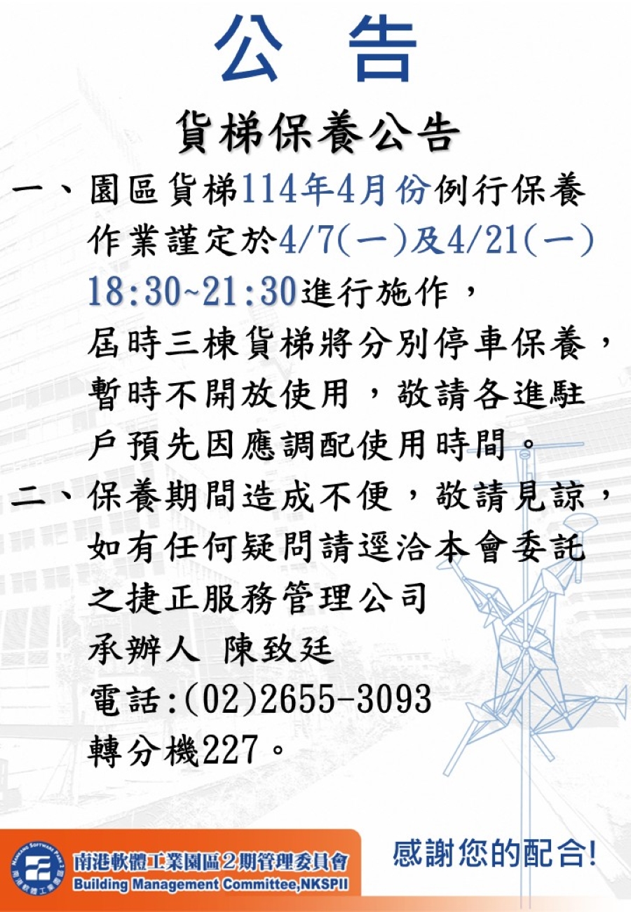 【園區公告】4月份貨梯保養