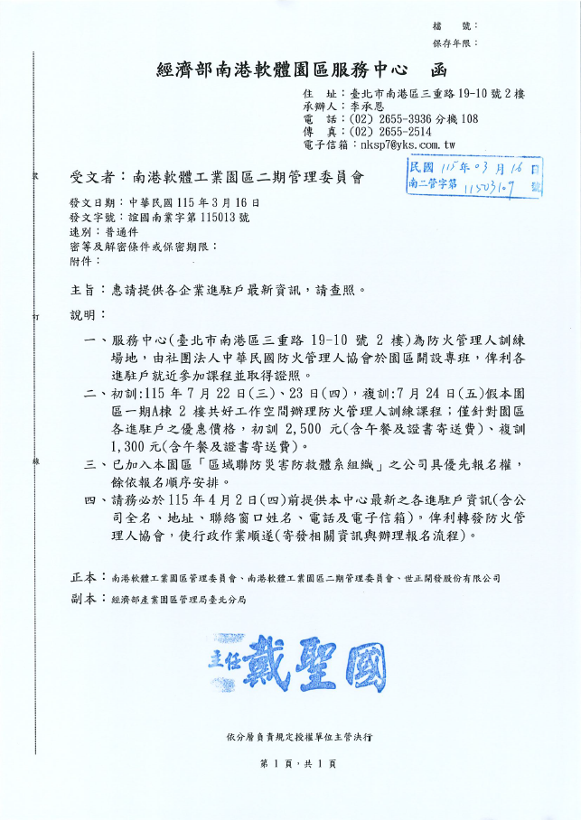 【函文公告】服務中心115年度防火管理人初訓.複訓課程資訊