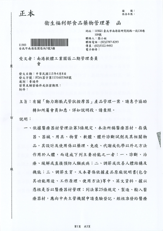 【函文公告】有關「動力膨脹式管狀按摩器」產品管理一案,請惠予協助轉知所屬會員知悉,詳如說明段,請查照。